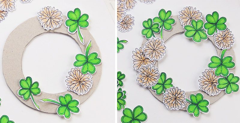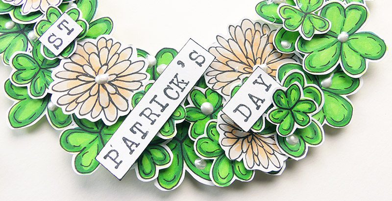 I then added a few drops of dimensional paint into the wreath and stamped out the text. I cut each word out and attached it to the wreath down one side. And then the project was finished. You could hang the mini wreath up on the wall to decorate your home or glue it onto a card to send to a friend. Have fun creating your own St. Patrick’s Day clover wreath!
