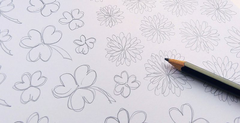 The first step is to sketch out all the elements if you have acrylic or rubber stamps you can also stamp out the objects you want to use in the wreath. For the project today, I am drawing lots of clover leaves and a few clover flowers. I am varying the size of the elements as I draw them, this will make the wreath look more organic at the end. After sketching the next step is to trace over all the pencil lines with the fine liner.