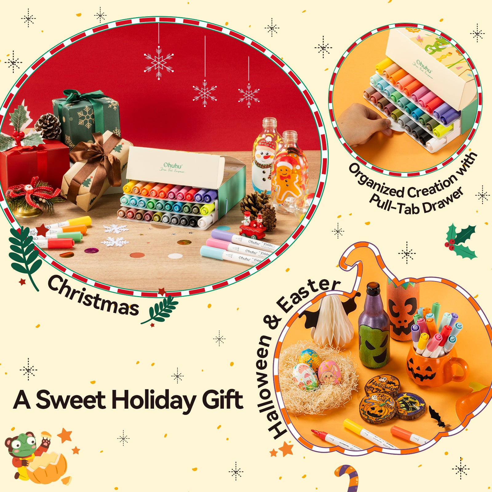 Packaged in an elegant pull-tab case, Ohuhu acrylic pens offer a seamless unboxing experience and tidy storage. Whether as a festive gift for Halloween, Easter, Christmas, birthdays, or as vibrant art supplies for a lively luau party, this set is a thoughtful and inspiring present for creative minds of all ages.