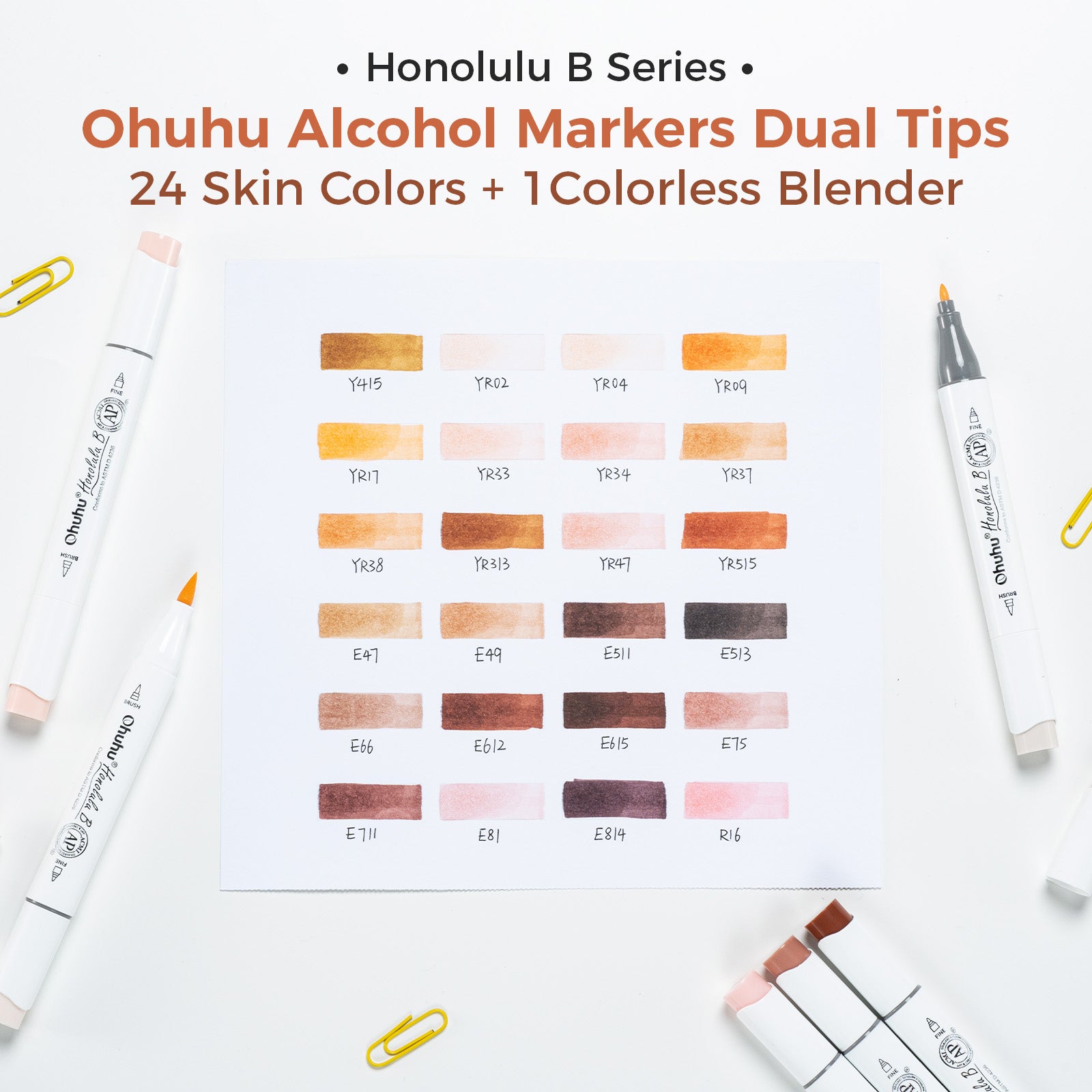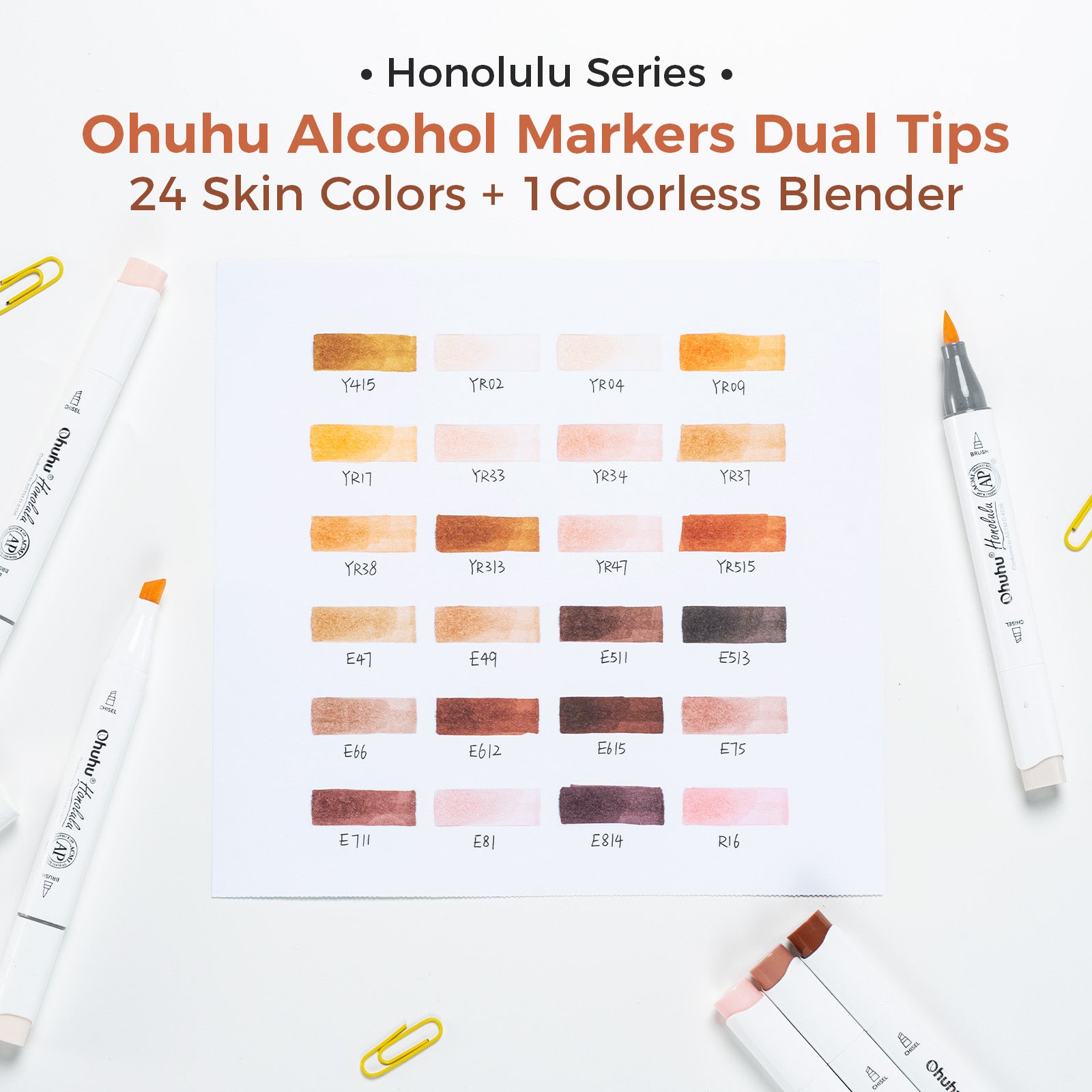The Ohuhu 24 Skin Tone Marker Pen Set is designed for flesh, face, manga, portrait, illustration, drawing, sketching and other artistic creations. These markers dual tipped with fine tips for detailed lines while chisel-edged tips for wider strokes and easy coverage. The alcohol-based ink is non-toxic, acid-free, and dries in a flash. Besides, the colored caps for hue identification and preventing from volatilization are user-friendly. Also a carrying case keeps all your markers close at hand and convenient for portable use