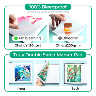 Ohuhu's marker paper is made from 150GSM (90LB) FSC-certified paper, ensuring durability and sustainability. With a specially toned-down whiteness, the smooth surface works perfectly with Ohuhu alcohol-based markers. While ink drying time may vary slightly from regular paper, even beginners can create worry-free without ink bleeding.