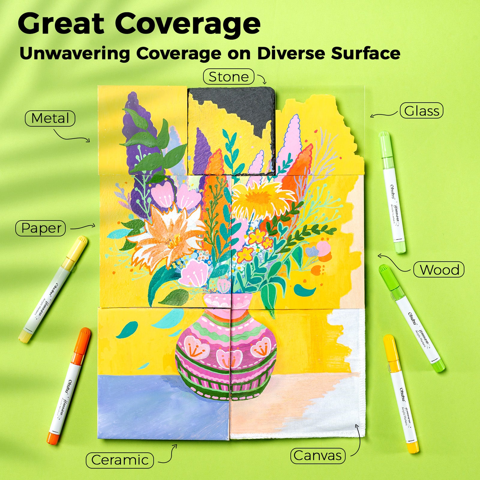 Bold, vibrant color on more surfaces. Ohuhu acrylic paint pens cover well even on dark or black backgrounds, making details stand out with less layering. Once dry, the paint adheres well to rocks, glass, ceramic, plastic, eggs, and more, with a durable finish that resists scratches and helps prevent peeling or flaking.
