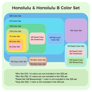 Honolulu and Honolulu B sets have an inclusion relationship. To avoid purchasing duplicate colors, you can choose the appropriate set based on the following inclusion guidelines