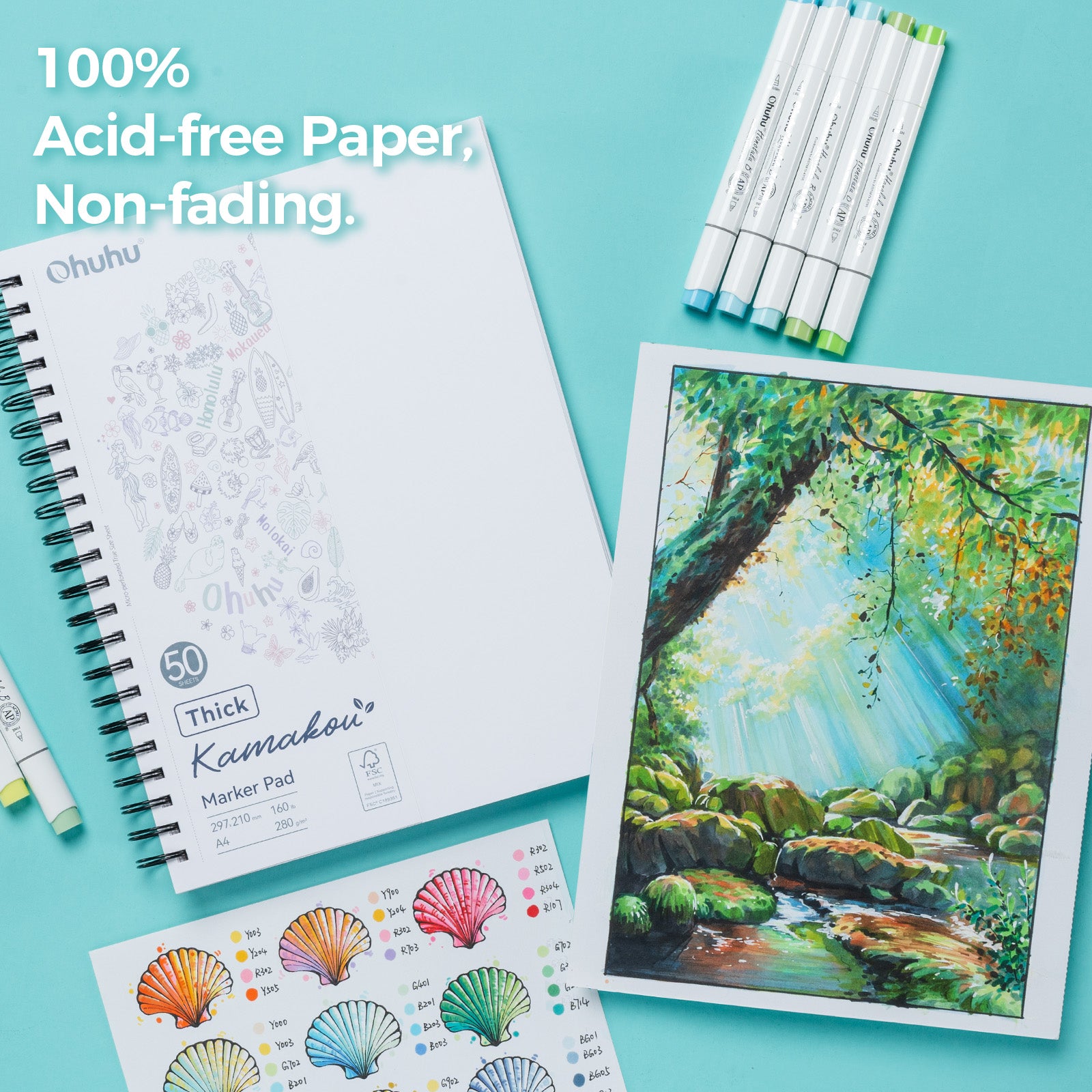 Ohuhu second-generation double-sided marker paper, made from 160 lb/280 gsm FSC-certified paper. The warm white paper provides a comfortable drawing experience, and its smooth, even surface pairs perfectly with Ohuhu alcohol markers, delivering enhanced color performance even with lighter shades. Ink drying time is significantly improved compared to Ohuhu 90 lb/150 gsm marker paper, making it ideal for artists who prioritize faster drying times and prefer bright white paper.