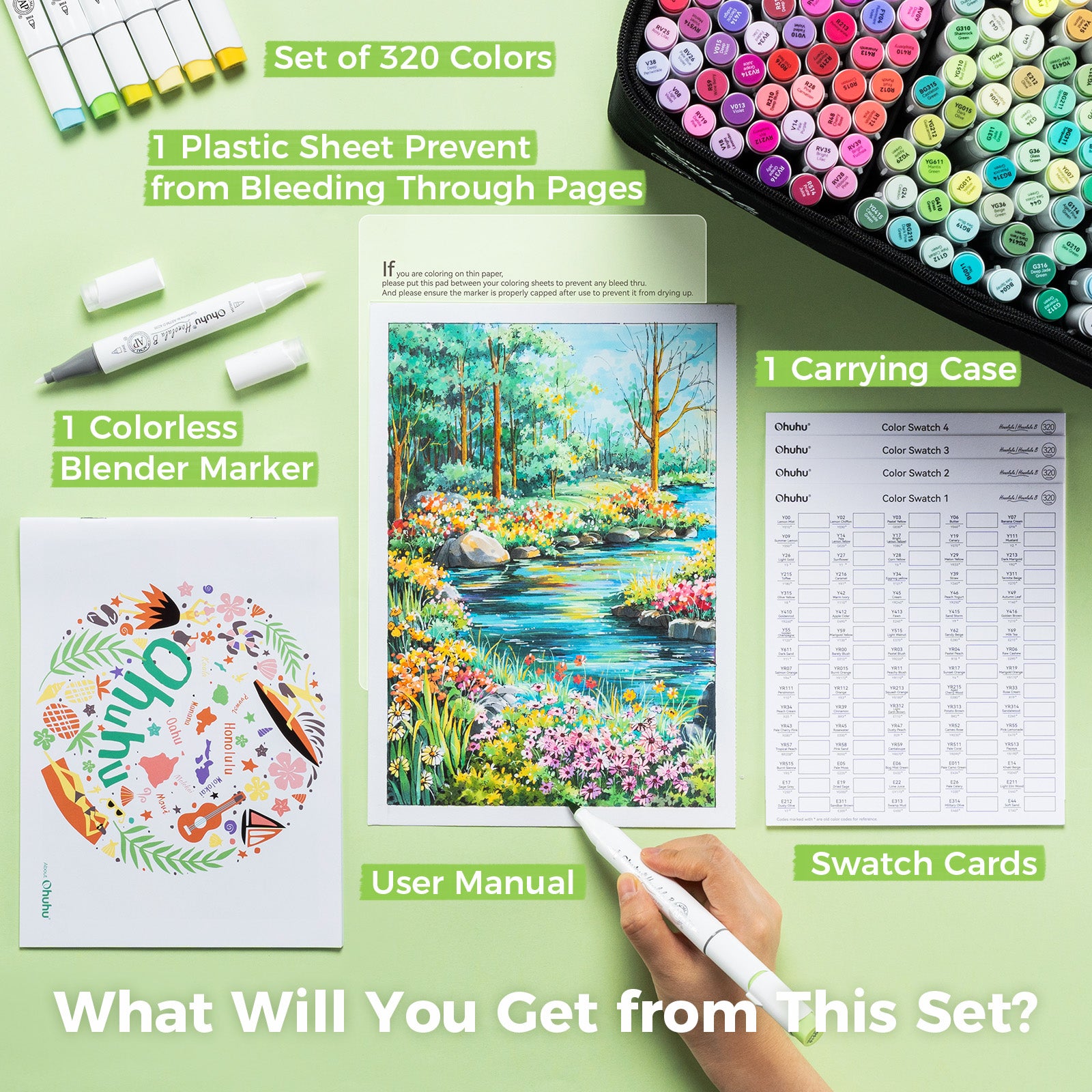 Package Includes: Art Marker Set in A Carrying Case with 320 Unique Colors, 1 Colorless Alcohol Marker Blender, Color Swatch Cards, 1 User Manual & 1 Plastic Sheet for Prevent Ink from Bleeding through.