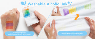 Spills and stains are no problem! The ink rinses off skin easily with soap and water, and most fabric marks come out in the laundry—perfect for young artists and busy creatives who want hassle-free cleanup.