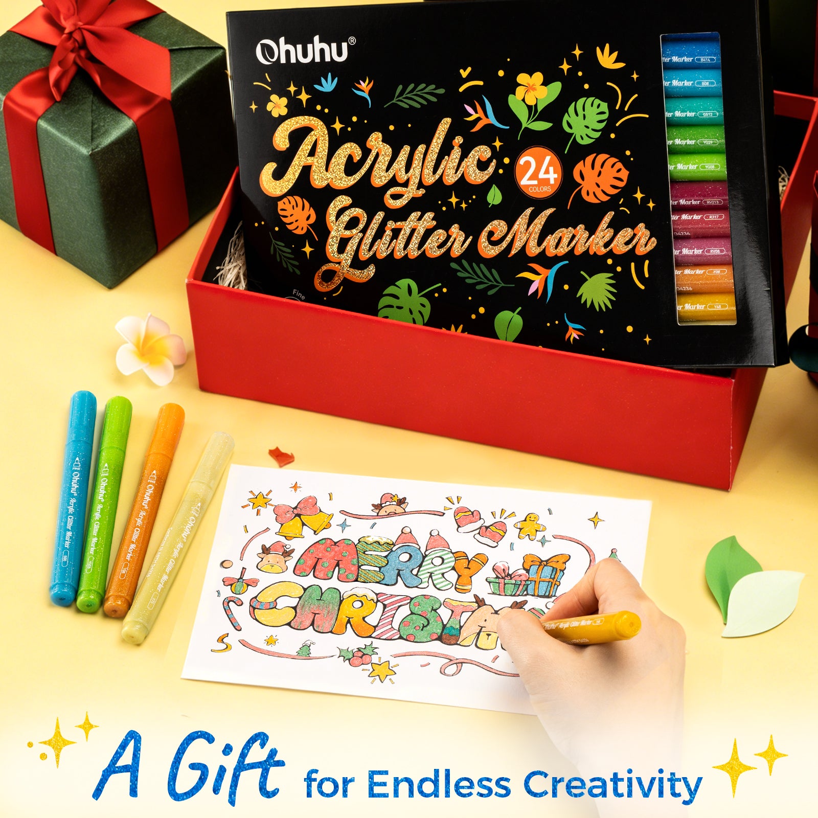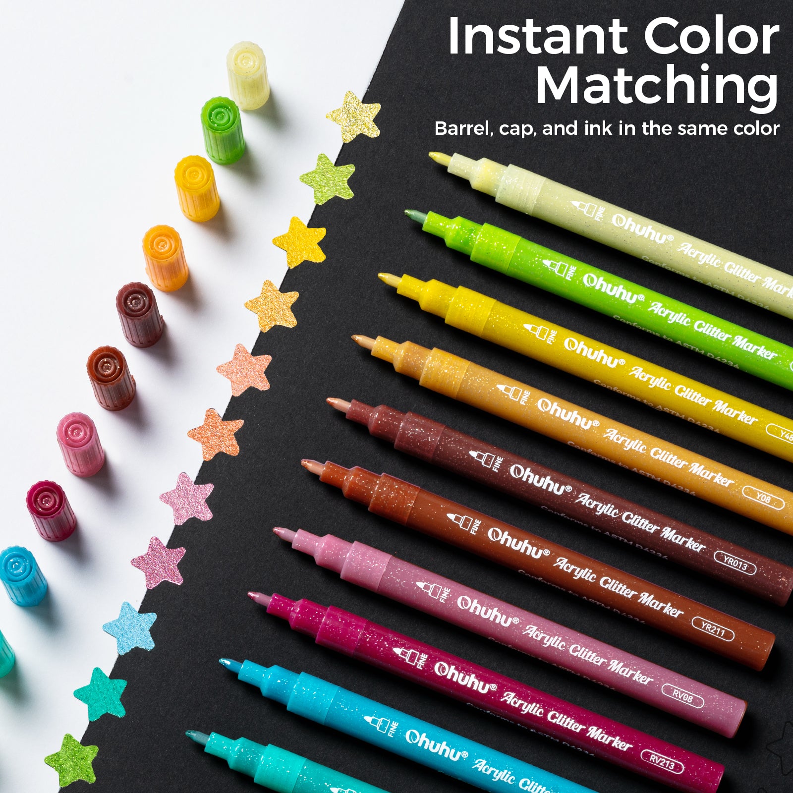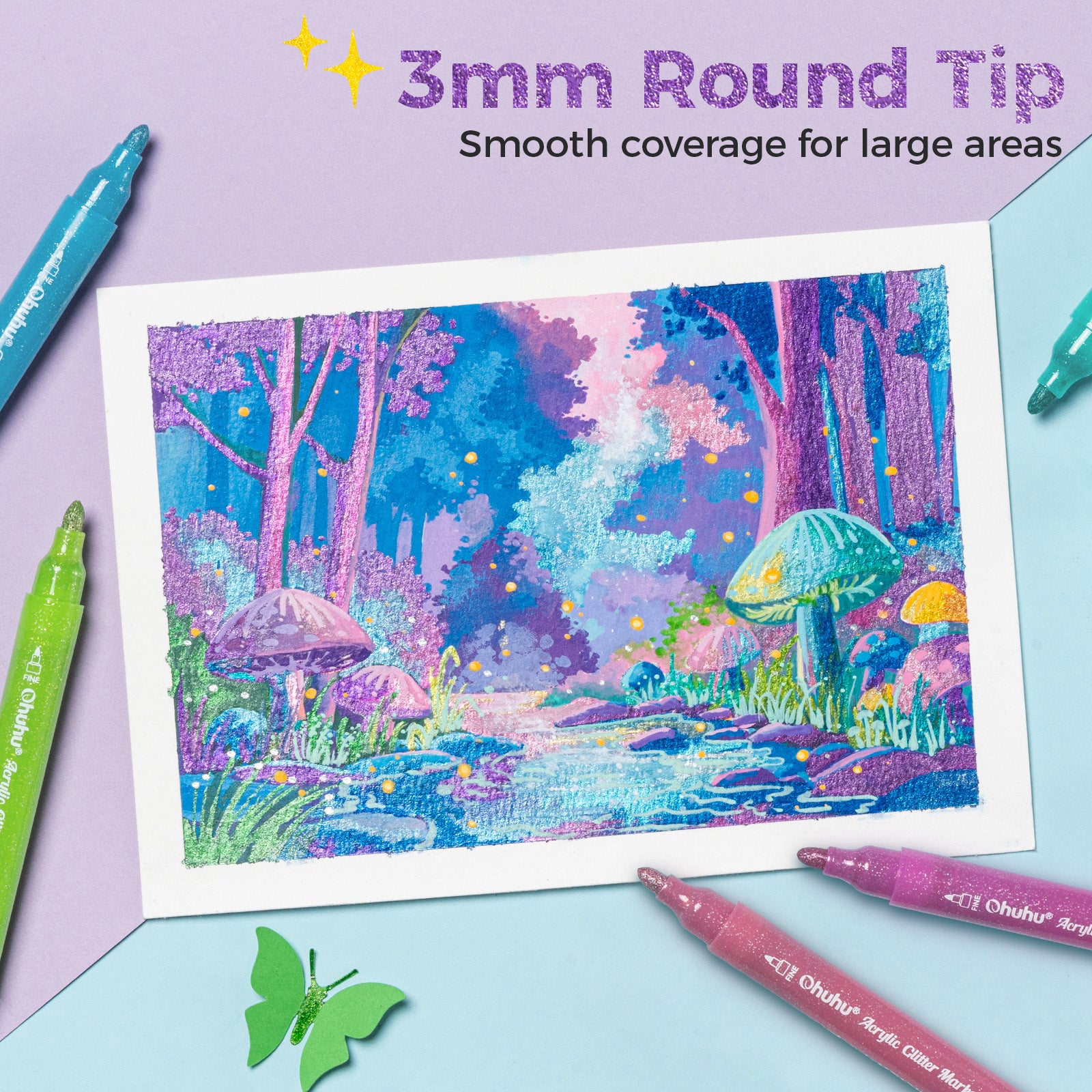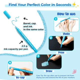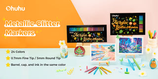 Ohuhu’s 24-color glitter markers are available in single-tip sets: 0.7mm fine tips for delicate details, or 3mm broad tips for bold strokes, delivering smooth, consistent ink flow for extended use—up to 200 meters of drawing length.