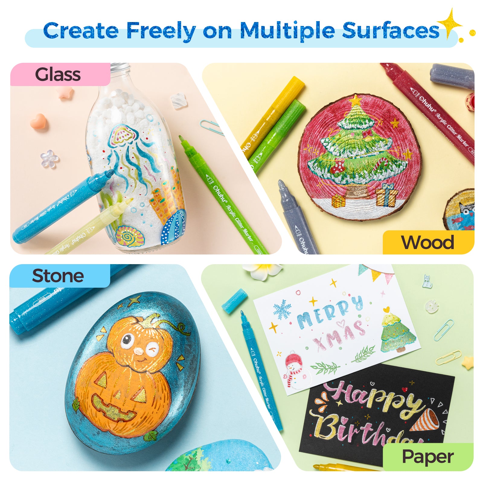 The Ohuhu Glitter Metallic Pens provide an expansive array of creative possibilities. With their smooth ink, durable tips, and crisp and clear lines, this range of pens can be used to make precise fine strokes or to fill wide irregular areas. Unleash your imagination with Ohuhu!